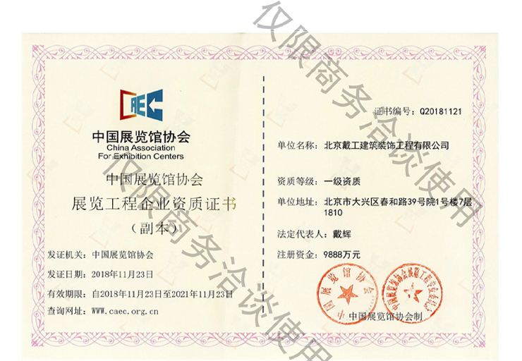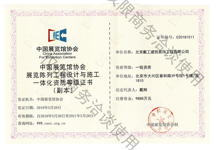 中國展覽館協(xié)會展覽陳列工程設(shè)計與施工一體化壹級資質(zhì)